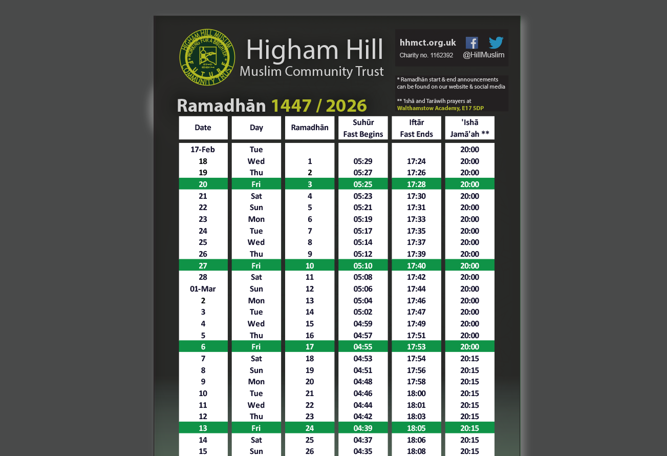 Higham Hill Muslim Community Trust has been providing services to the local community since 2014. We provide Taraweeh, Eid Prayers, Jumu’ah Prayers, Youth Activities, and after school Islamic Classes (Maktab). Following the Covid-19 pandemic, our services now include a community Funeral Service and food support for families in need.