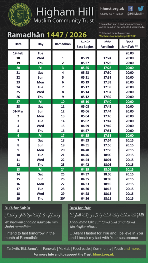 You can download our timetable for Ramadhān from this page. The timetable is available in the following formats: